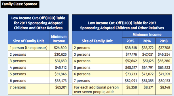 Tables and charts can be extremely useful for consolidating a large volume of information into a simple, clean, and easy-to-read format. By combining all relevant information into one table, you can access key ideas in one place. You might consider using tables to organize applicable statutes, rules, or procedural timelines. Ideally, tables will be a quick reference point to help you locate important information. The table below illustrates the 2017 Low Income Cut-Off requirements for sponsorship of different people under the family class.