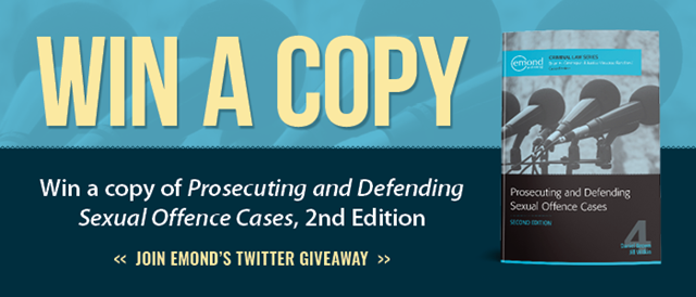 Emond Publishing is partnering with Daniel Brown, co-author of Prosecuting and Defending Sexual Offence Cases, 2nd Edition, to give away a free copy of the new and best-selling title. This edition contains new chapters on historical sexual offences and cross-examination on private records, and reflects changes in Bill C-51 pertaining to third party records, other sexual history, and consent. Analysis of case law and relevant Criminal Code provisions have been integrated throughout in order to effectively guide readers through the flow of a sexual offence case.
