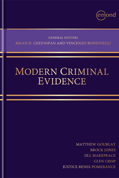 Modern Criminal Evidence (MCE) is the seventeenth title (the other 16 presently in first, second or third edition) published by Emond Montgomery in its ‘Criminal Law Series’. The series, which includes two Walter Owen Book Prize recipients, is supervised by two Toronto general editors: ubiquitous barrister Brian H. Greenspan and Justice Vincenzo Rondinelli.