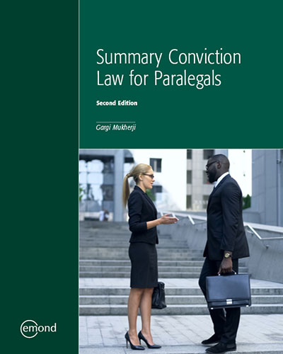 Summary Conviction Law for Paralegals, 2nd Edition provides a clear and comprehensive guide to the criminal justice process, outlining every aspect of a summary conviction, from preliminary matters to sentencing and appeals. This all-in-one resource, designed specifically for paralegal diploma programs, balances the theoretical and practical application of criminal law from a paralegal perspective, addressing the elements of an offence, search and arrest, court attendance, witness provisions, disclosure, pre-trial conferences and applications, remedies, trial strategies, sentencing procedures, appeals, and more.